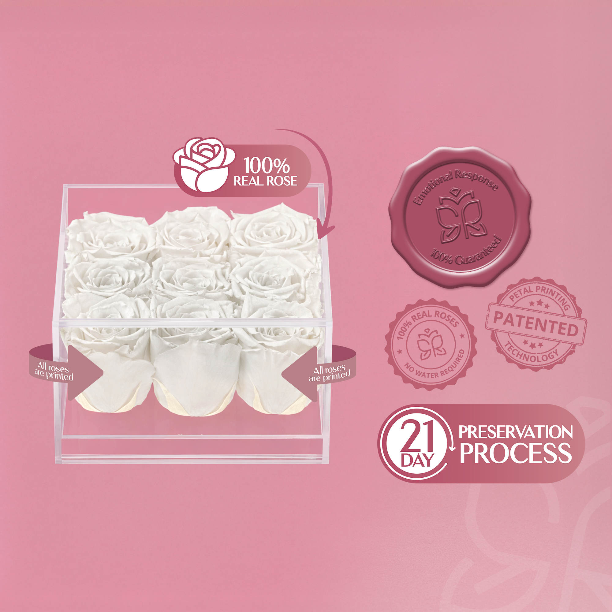 Encased in a flawless, minimalist crystal display, this arrangement dazzles from every angle. Its clean lines and elegant silhouette reflect light beautifully, turning each rose into a glowing symbol of love, gratitude, or refined taste.